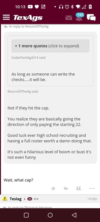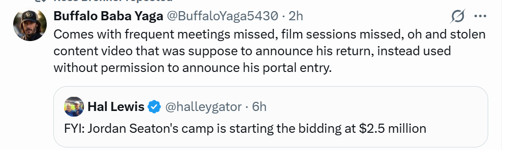 This isn't NCAA 2026. You don't get to just whip up scenarios and then go make them happen. There are not currently two OGs in the portal worth $1M+ each. I'm not seeing any swing Tackles fitting that description, either. Meanwhile, Texas has been working with the agent on Seaton's outlook and portal entrance for more than a month. How about taking what is actually available as a scenario and focusing commentary, hopes and fears, and whatever else floats your boat on that versus wishcasting and acting as though your premise is real? There are not going to be this many schools that can meet the ask. Nakos clearly talked to Oregon, Texas, Florida and ATM. Two are in and two gave it the old "don't count us out!" The other programs are names dropped from the agent end. That serves Nakos just fine, as that is some hearty clickbait. There are very few schools left standing with the dry powder this is going to require. Miami could well think they could be a player, but they have no idea what danger their current roster could be in from an attrition aspect, as almost all other schools have already discovered. Ole Miss doesn't have the juice and I'm skeptical of LSU, given how much they have committed in so many different directions already, especially since they're poor and spending money they don't even have after signing Leavitt. Ohio State and Tech could be players if they want to be. It's got to sting Joey McDUI to have to go back to Campbell and say "I know we've committed millions in dead money this year to have Ojo wearing our jersey on the sideline, but I've also found this OT that we really need for 2026 and he's going to cost us double+ for what we're paying Ojo." See above.