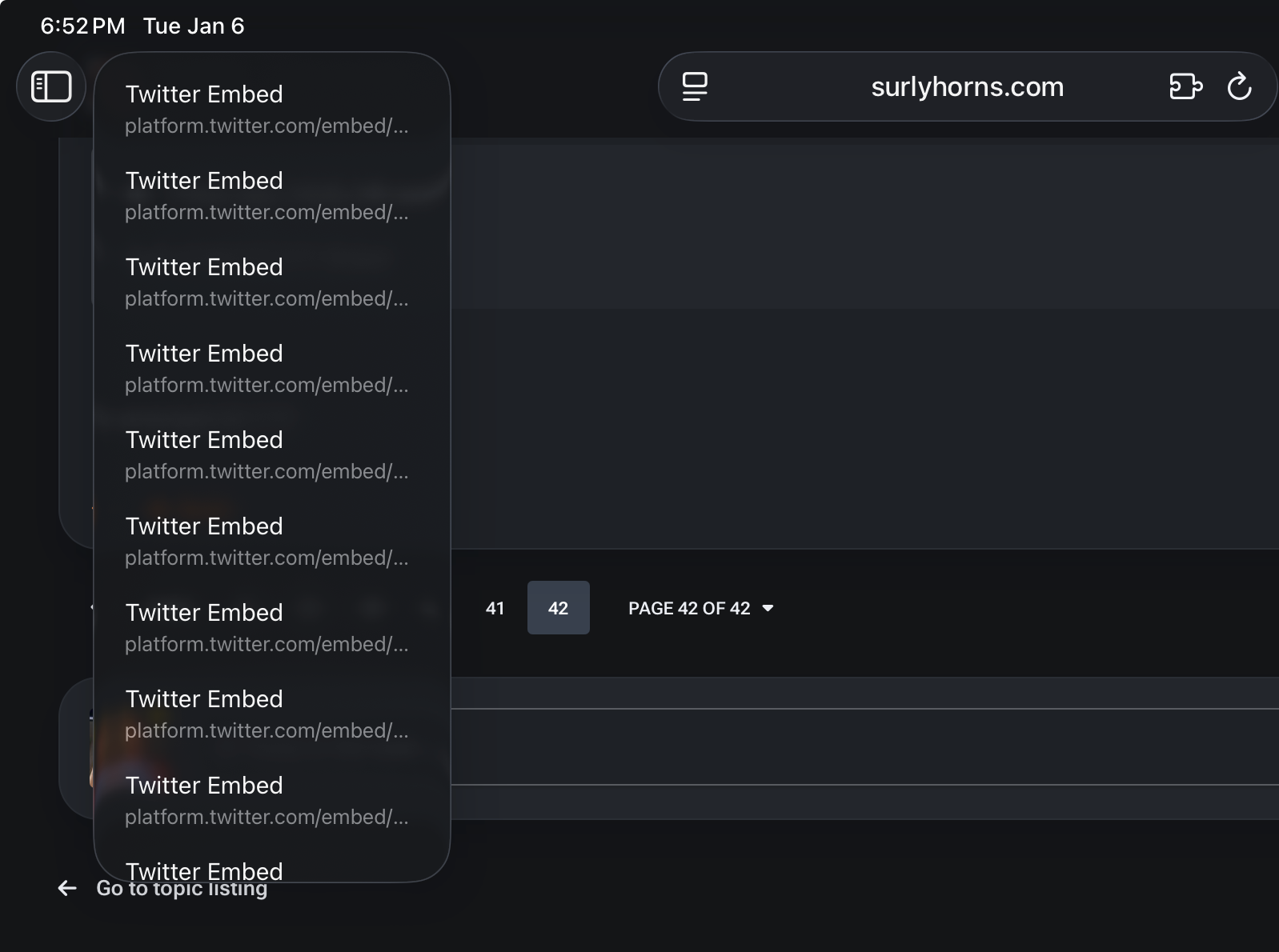 i typically swipe to go back, just showed the back button so imma could see all the embeds as separate pages. sometimes when i swipe to go back i end up in a loop where the same page loads over and over. other times it takes me to individual tweets with each swipe. the loop happened before the switch, i think this twitter embed thing is new.