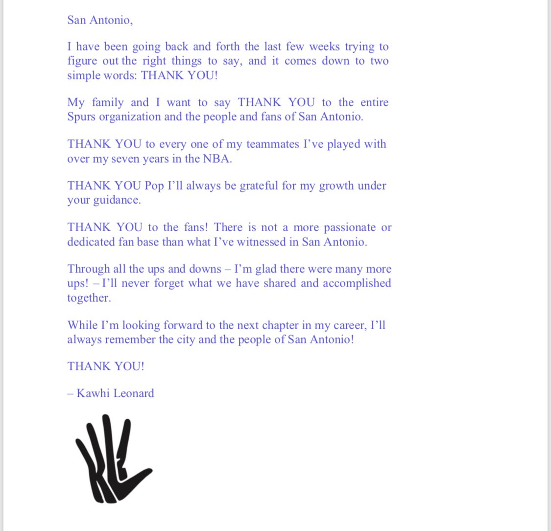 That letter was about as generic as it gets. Kawhi doesn't give two shits about SA and that showed last season. Also, why the fuck is he using blue font?
